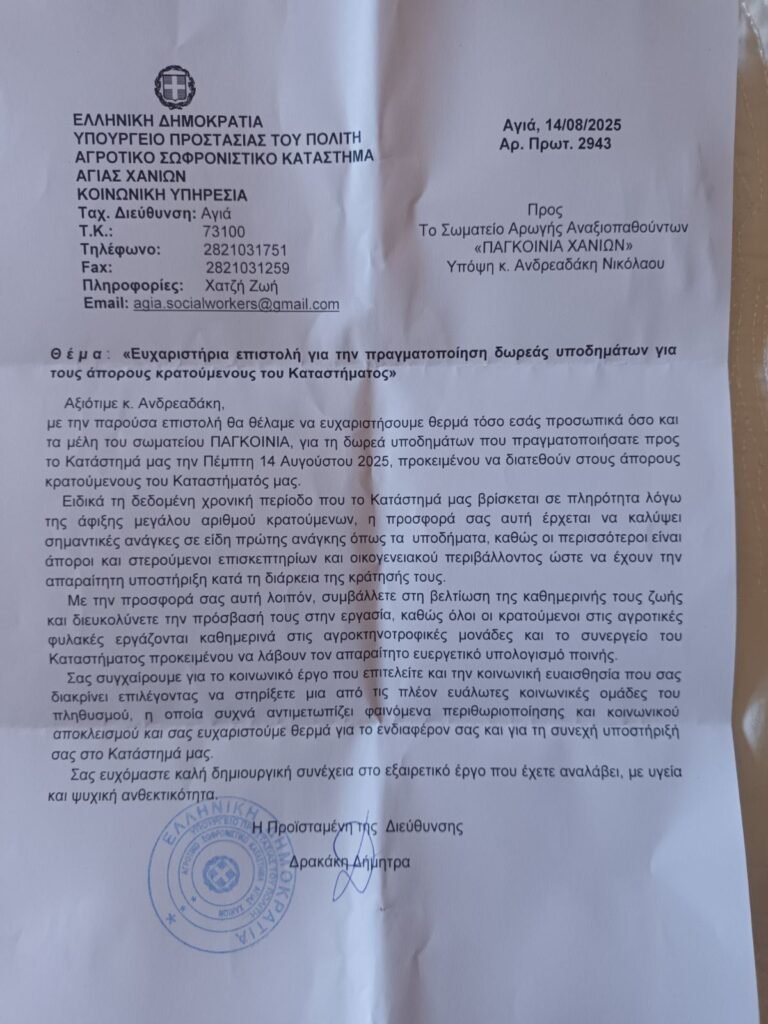 Το σωματείο προχώρησε σε μια πράξη αλληλεγγύης, προσφέροντας 20 καινούργια ζευγάρια παπούτσια ως δωρεά στις Φυλακές της Αγυιάς. Η ενέργεια αυτή είχε ως στόχο να καλύψει βασικές ανάγκες των κρατουμένων και να βελτιώσει τις συνθήκες διαβίωσής τους.